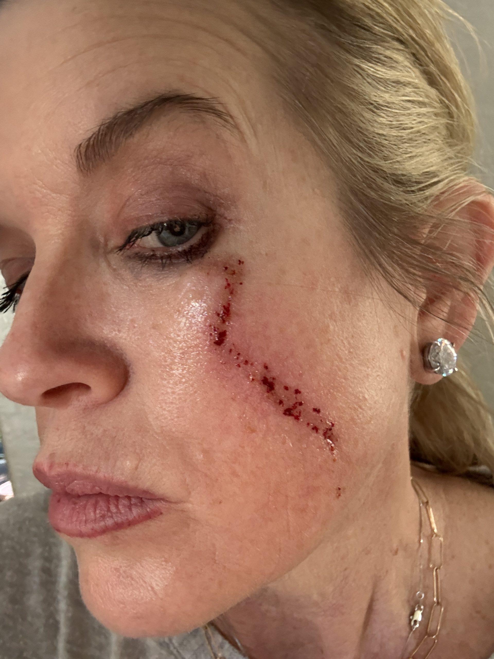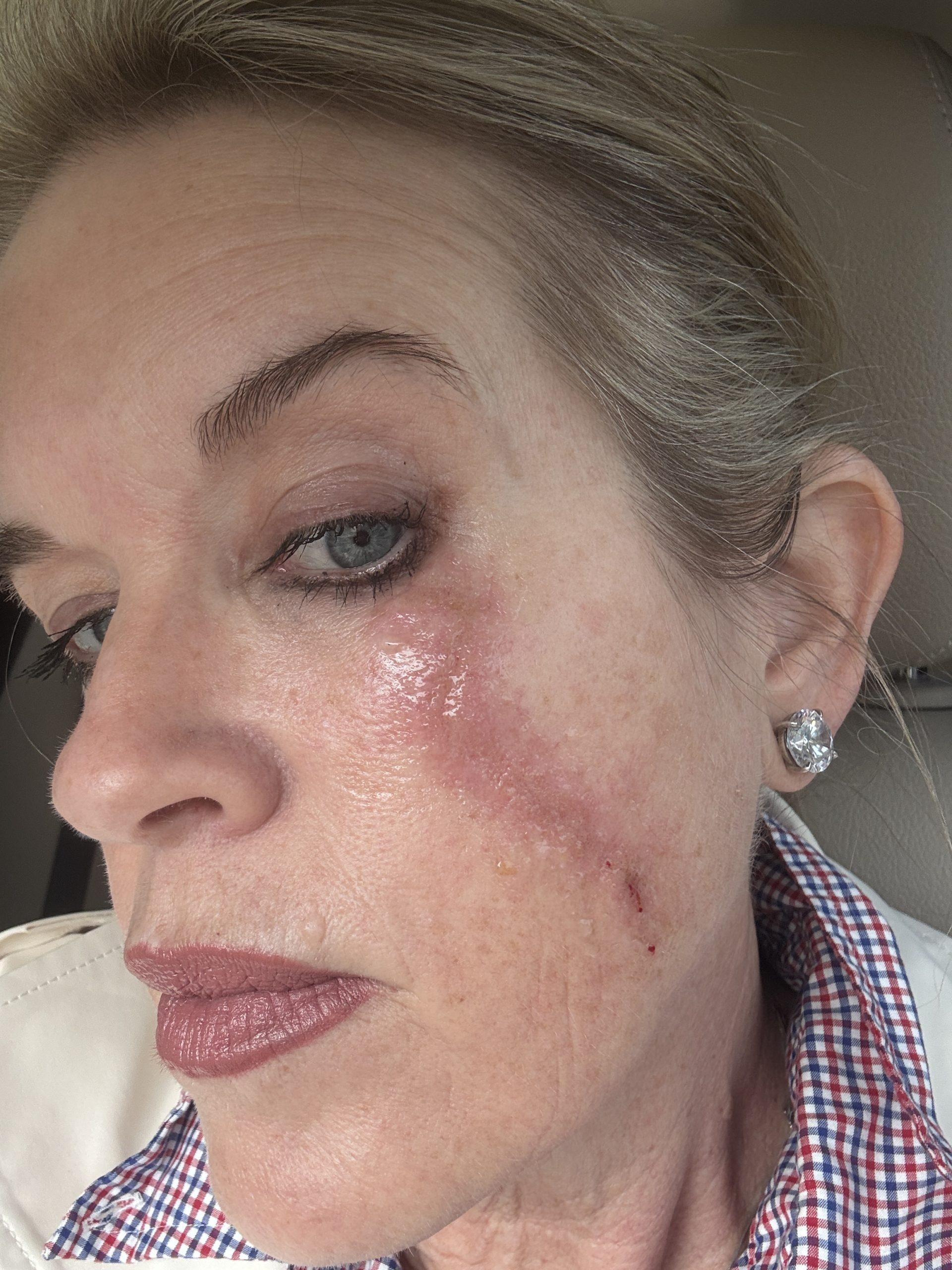 The laser process is only about 10 minutes. You use numbing cream about an hour beforehand, which helps; it does “smart” a little, but not horribly. The doctors did say, “You have a high pain tolerance?” After it’s a little hot, I take a few Ibuprofen, and you keep Aquaphor on it for 24 hours. It does bleed, ooze, scab over, and get messy. I will look like this for about 5 days.