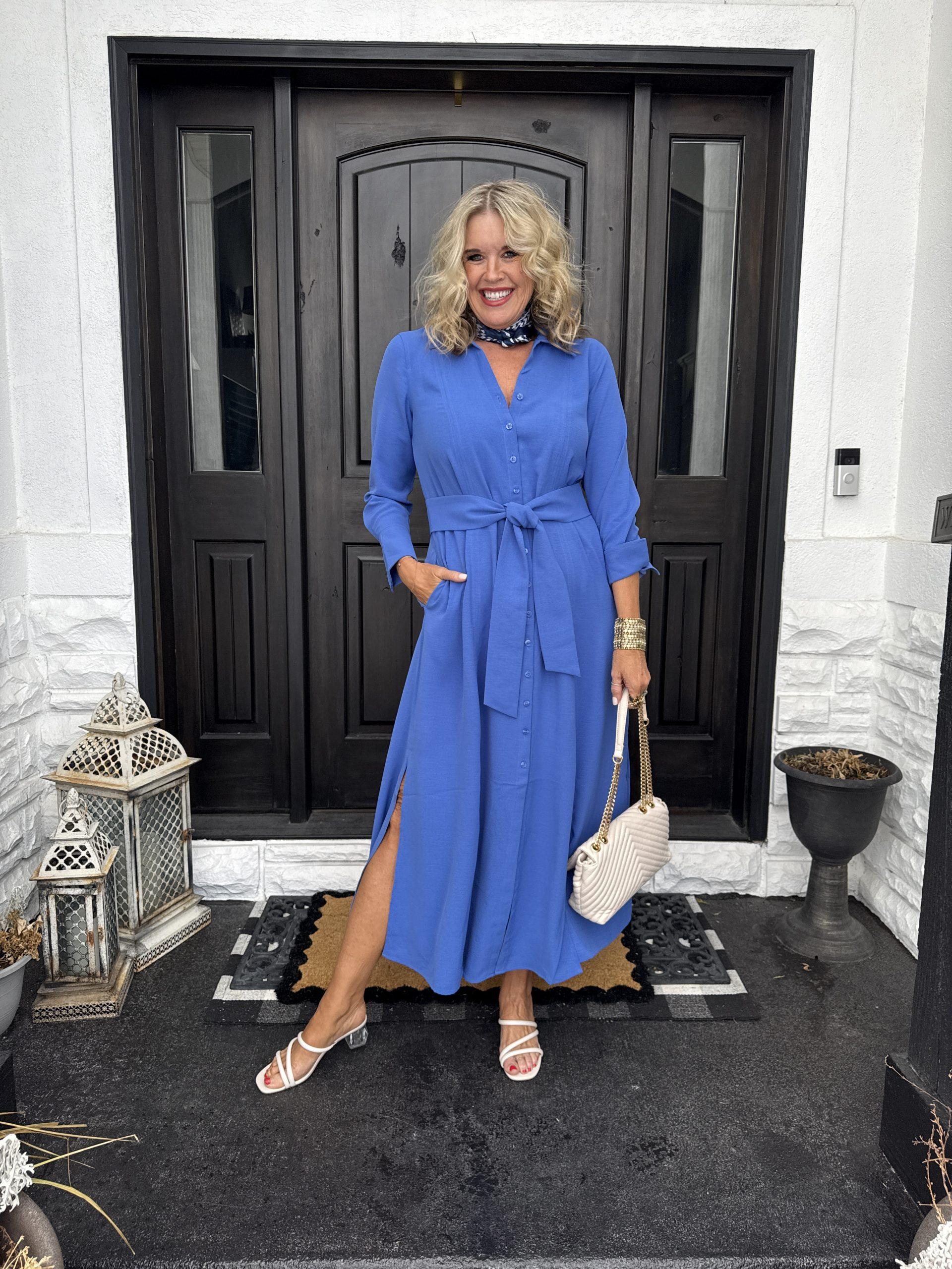 Spring is about color- This beautiful Cobalt blue 3/4 sleeve dress with tie waist, pockets, and darling front slits is so cute…Plus, it’s SALE and Fits TTS, and I am in the choice size 0 (4), Styled with white strappy sandals with clear acrylic block heal.