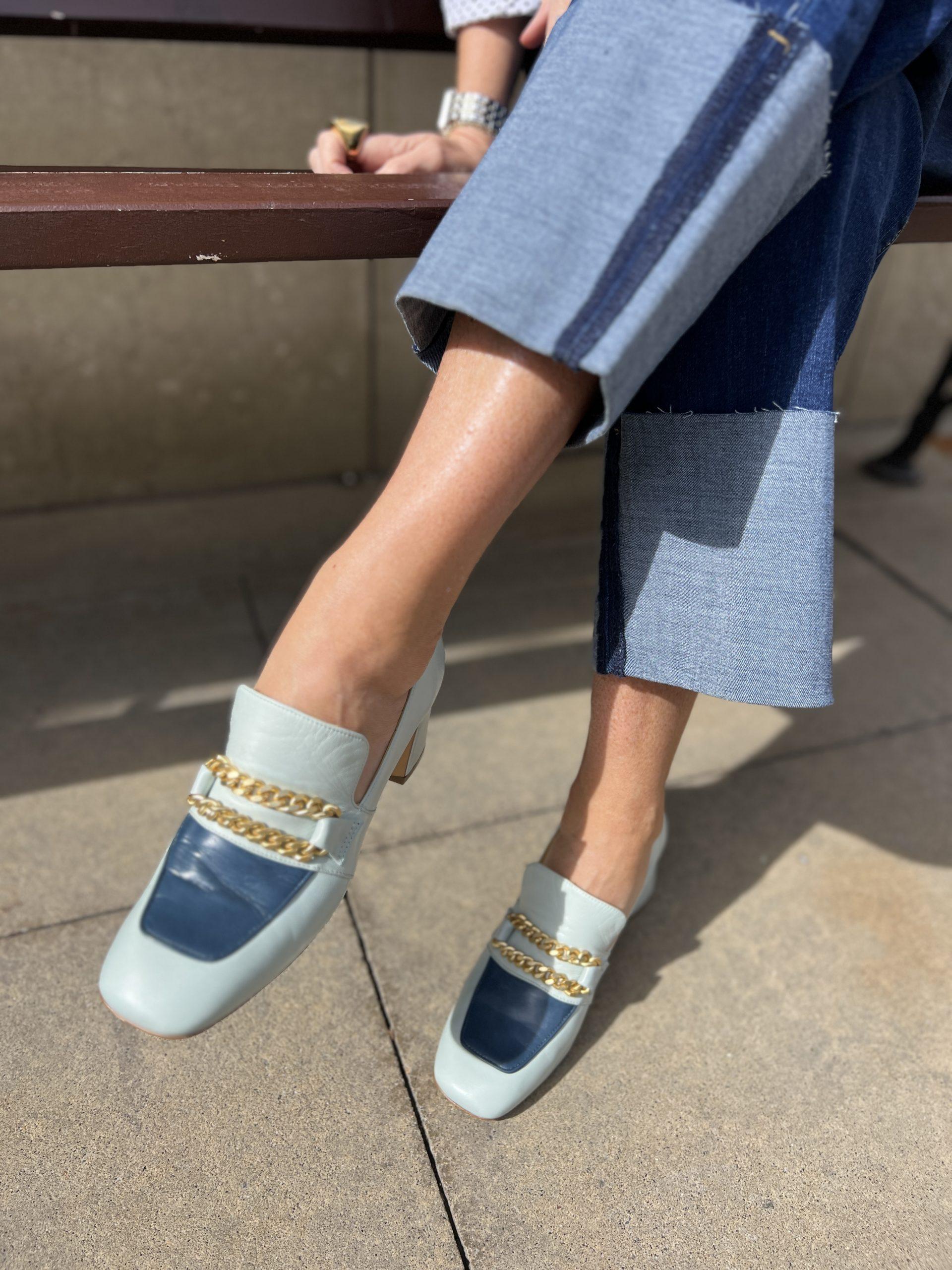 Today, I’m sharing a Chic way to wear them with a little Parisian vibe. You could easily copy this look by shopping your closet for items like this: a double-breasted blazer, a mock-neck cap sleeve sweater, straight-leg jeans in a medium to dark wash that you could cuff, a great pair of loafers, and gold jewelry.