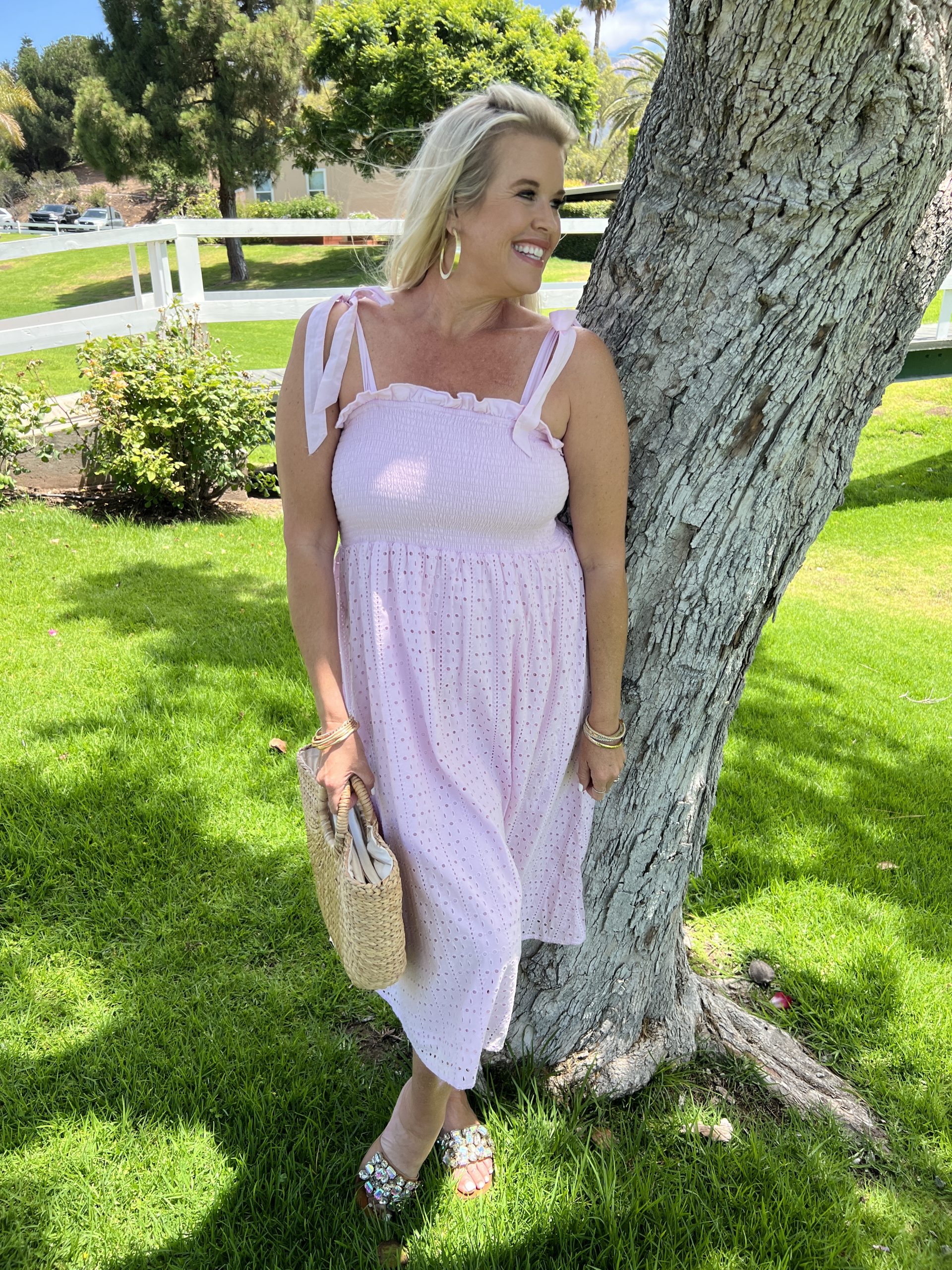 Eyelet has always been one of my favorite summer fabrics and when I saw this pink tie-shoulder dress, I knew I needed it in my summer dress collection and you do too.