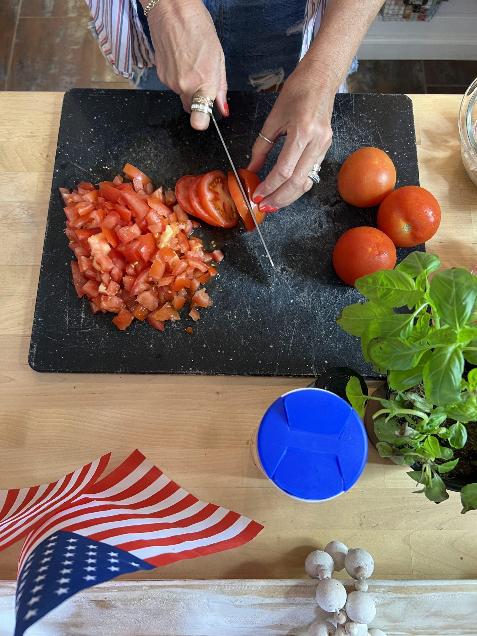 First, I cook the pasta as directed on the box, Then I marinate the chicken breast in olive oil, salt, pepper, and garlic, and my hubby grills it on the BBQ. (If planning, I always add extra chicken to the grill, then you’ll have grilled chicken later in the week.) As the pasta is boiling, I cut the tomatoes and onions, set them aside, and mix the dressing with the Newmans, Balsamic vinegar, sea salt, pepper, and garlic powder. When mixed up, add it to the tomatoes and onions, stir, and set aside.