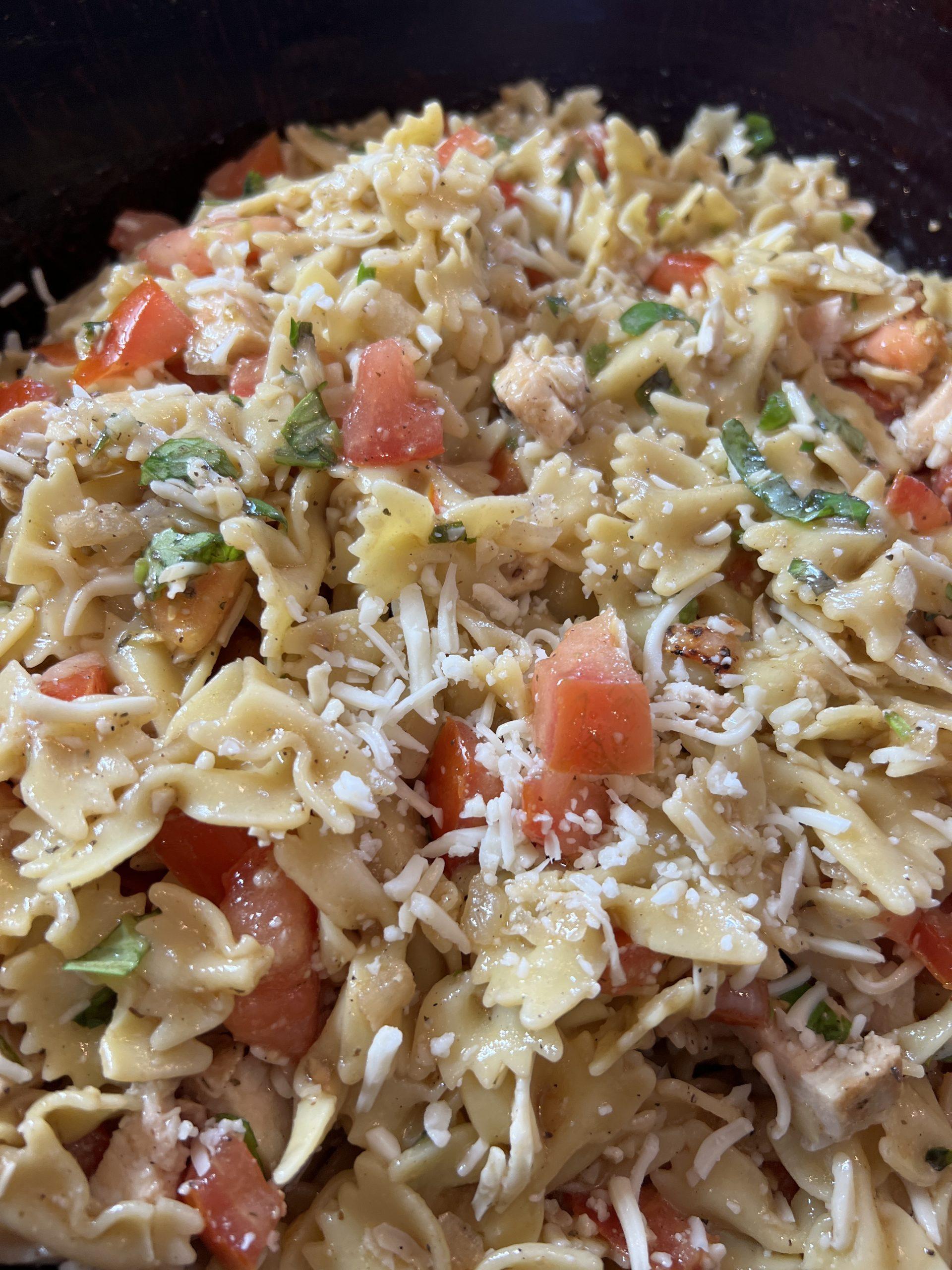 I love the flavor of Caprese, Tomatoes, mozzarella, and fresh basil. It makes for a great pasta dish and adds grilled chicken for protein.