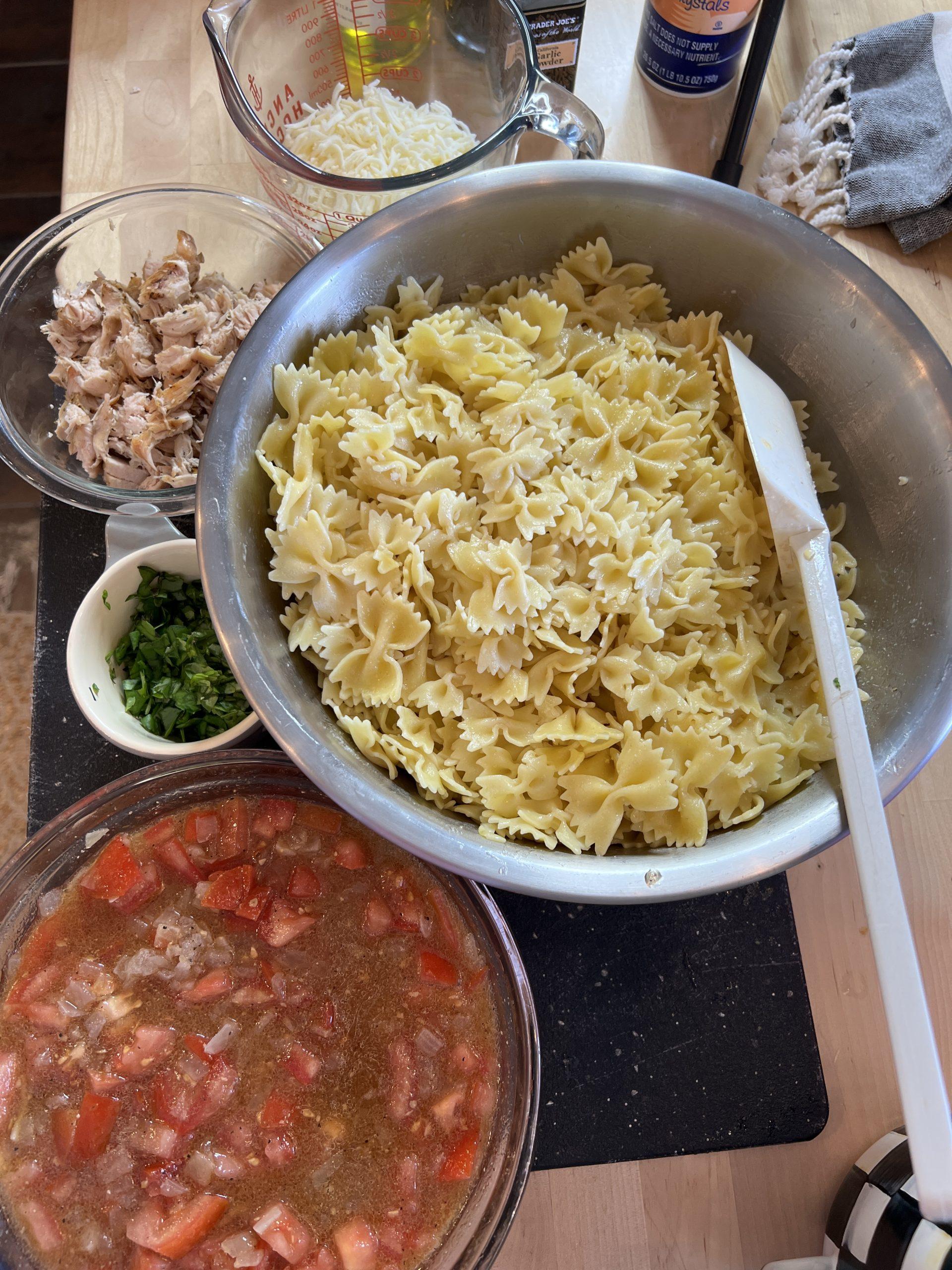 Caprese bowtie pasta salad with chicken big enough for a crowd