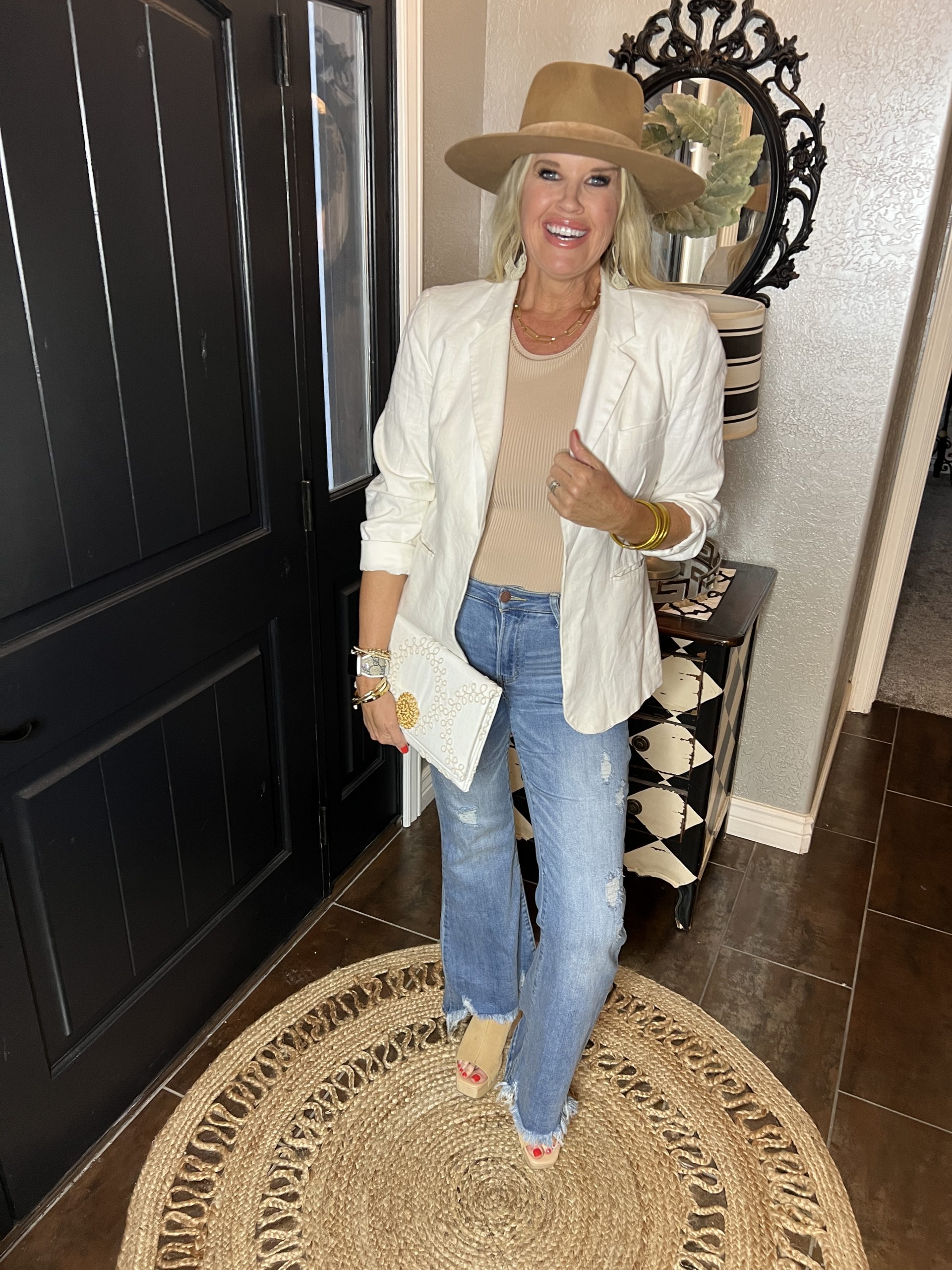 A Fall feeling… but the top breaths and is lightweight, cropped jeans, and open-toe shoes… easy to wear on an Indian summer day, yet gives the “feel” we want in the FALL months🍂🍁