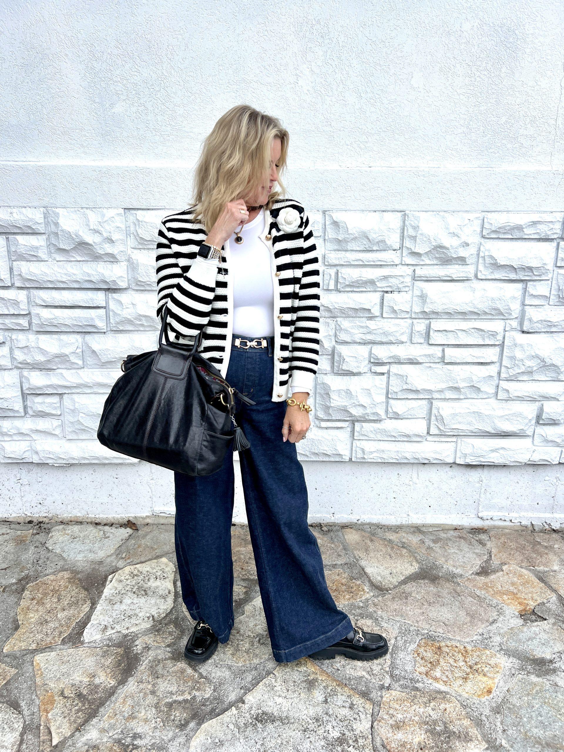 Today’s outfit combines trending stripes and wide-leg, high-waisted indigo denim, also trending for spring. This cute trending Lady’s Jacket is a fun Amazon find and affordable yet looks higher quality inspired by Chanel and is a cheaper version of the Jcrew version. The shorter length is flattering paired with high-rise, wide-leg denim. These flattering jeans and White Bodysuit are a “Best Seller” by Spanx.