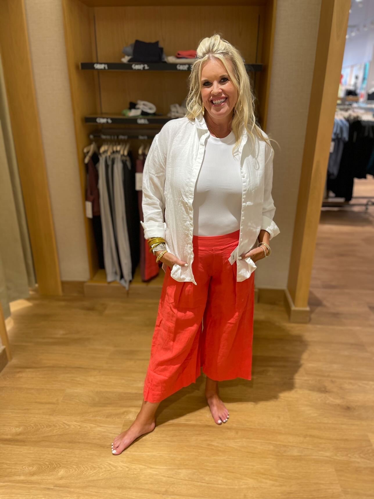 The oversized shirt boasts a stylish denim look, but it’s crafted from cool and breezy lyocell, which lends it a lightweight drape. Tailored menswear details, from a point collar to long sleeves with button cuffs to a back yoke, keep the design classic. I would Size Down in this top. Mom paired it wth these Mona Wide Leg Trouser Ankle Jeans, which also run one size smaller. She loved how comfortable this outfit is, and adored the shade of pink. It’s both our favorite color, in this shade.