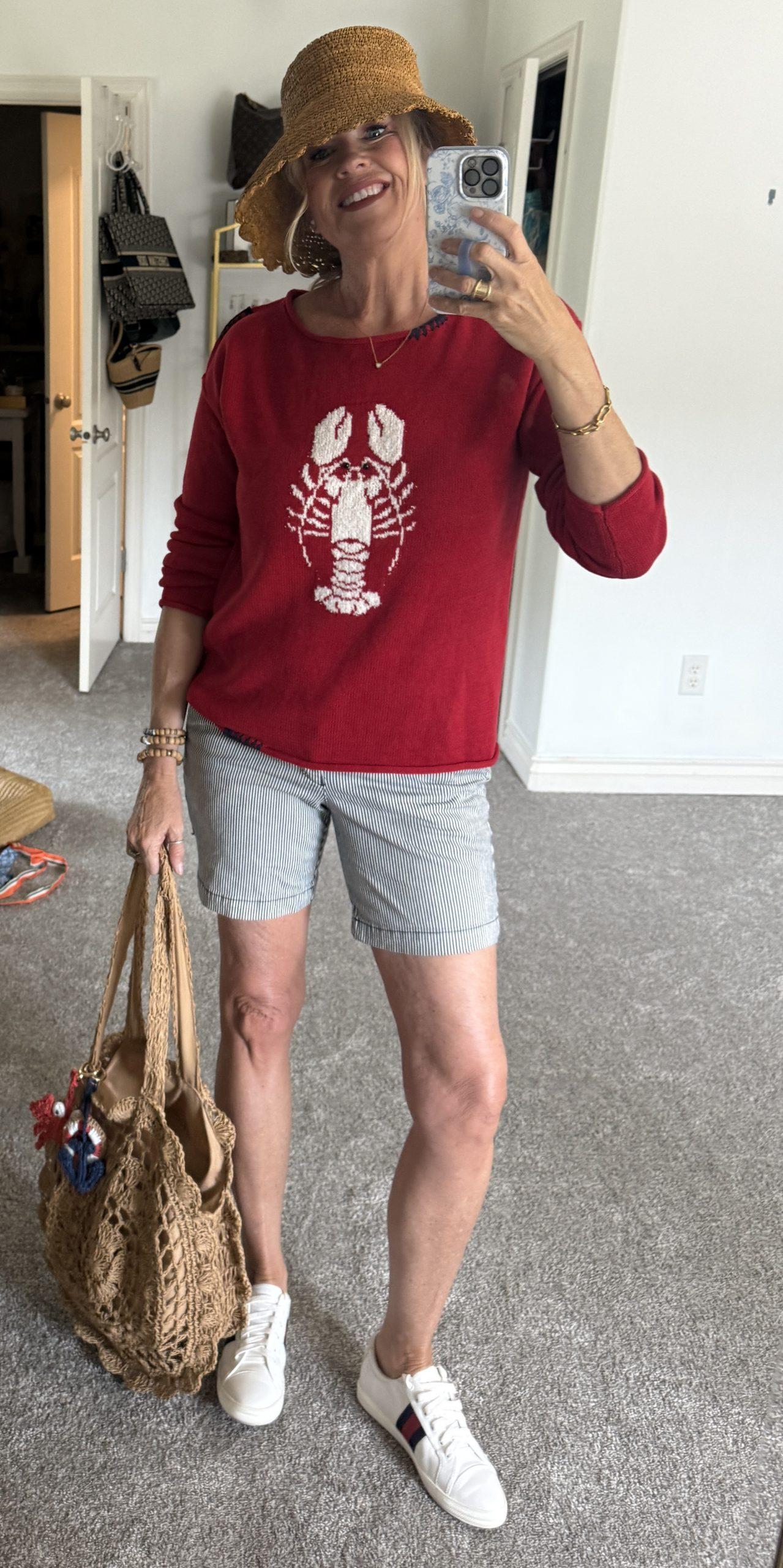 East coast summer vibes |Lobster tee (this one is by Jodi Petri) and not linkable. I linked a couple of lobster tees Below|Pinstripe skirt with pockets tts I am in a small| Cane and leather Mary Jane’s |Cane and leather tote by Eric Jervis |Straw bucket hat Anthro and get 20% off with code ANTHRO20 ends on 30th|Red scarf |Rattan belt |Earrings Hoops Amazon |Red bracelets Budha girl|Denim shirt (Chicos) sold out Linked similar HERE|