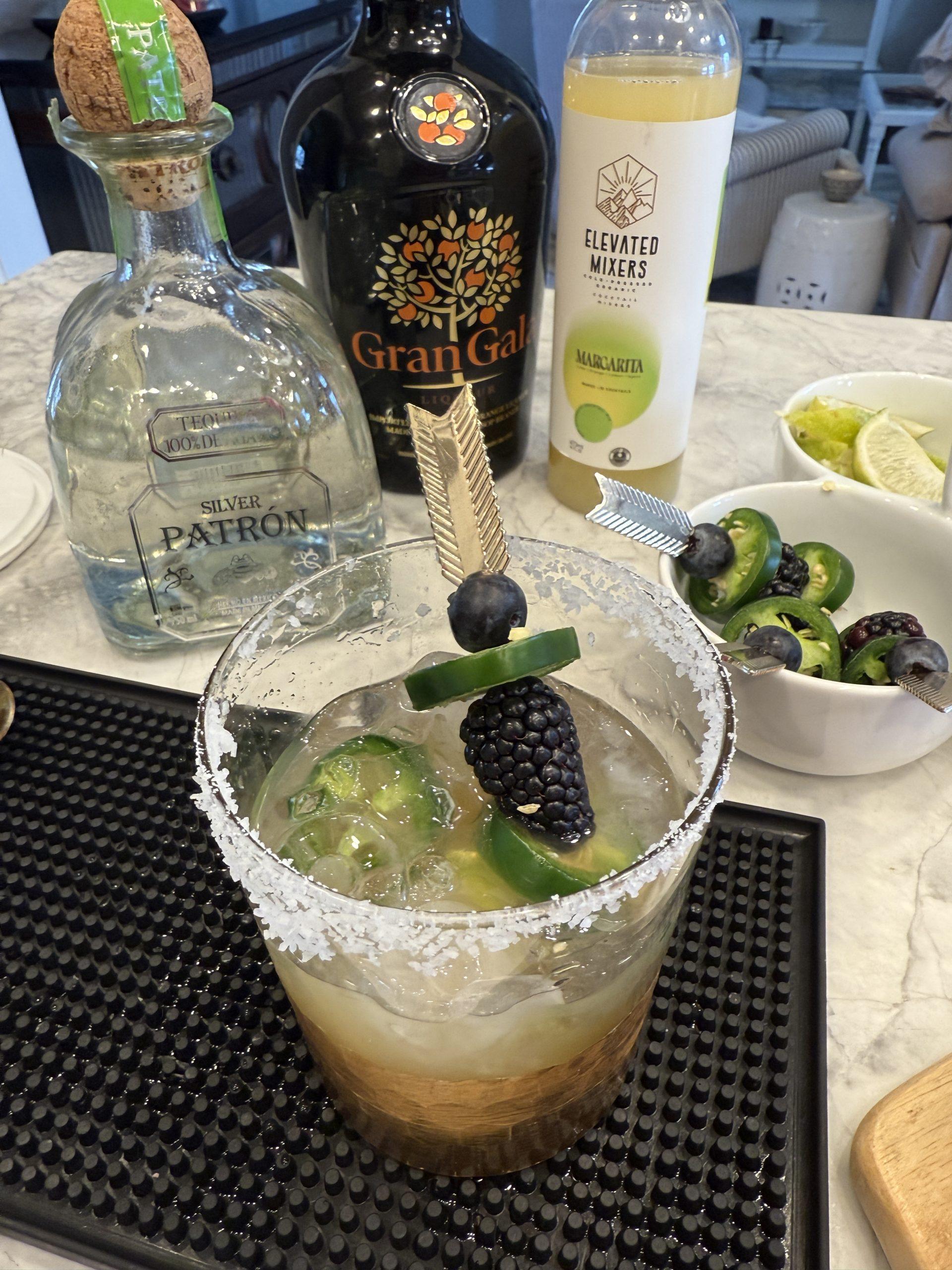 Rim the glass with lime and dip it into salt. Add ice and one shot of Tequila, mix, stir a lime squeeze, and drop in a couple of Jalapeños. Stir (I also like to muddle in blackberries), stir, and float with liqueur. Top with a jalapeño, blackberry, and blueberry skewer.