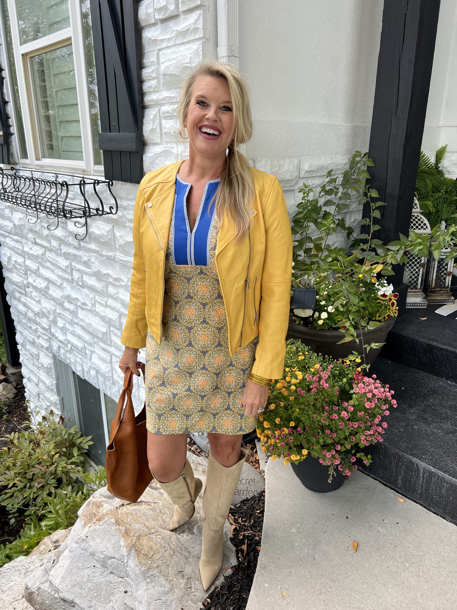 Many Cabana life pieces can be easily styled for Fall, paired with booties, a denim jacket, Sneakers, and a blazer. I adore this Fun golden yellow and blue printed tunic perfect color’s for Fall. Styled below with a leather jacket and tall boots with a western flare.