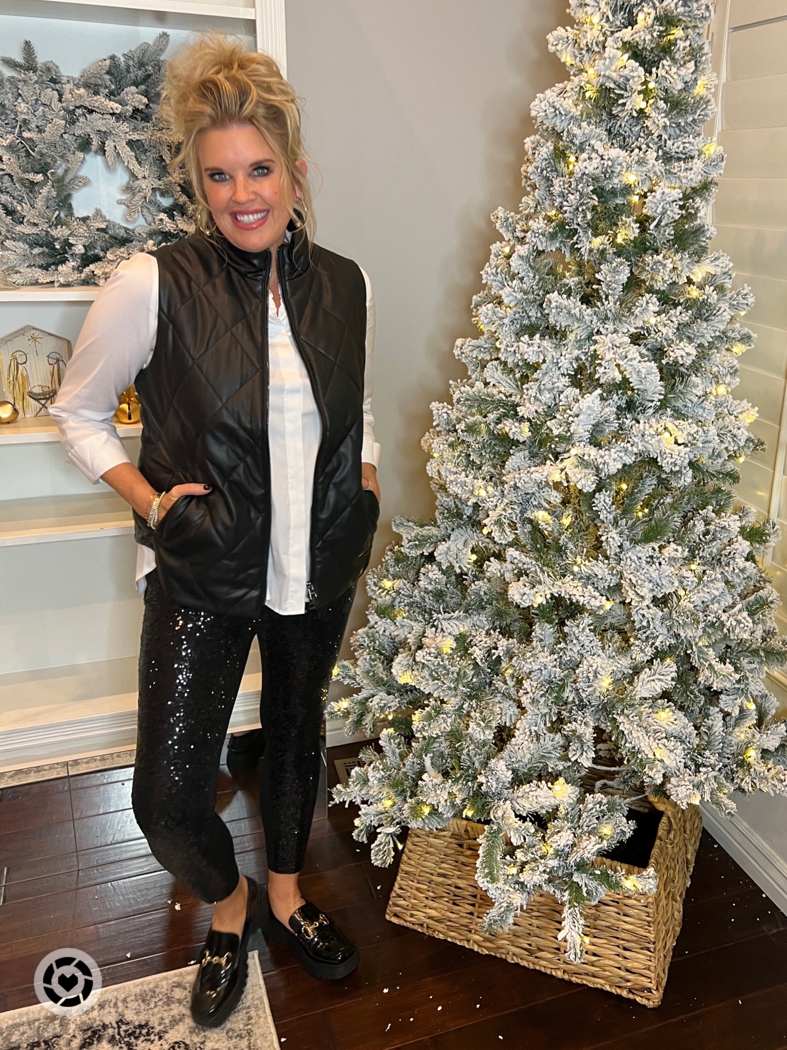 Faux Leather quilted vest– Leather always “ups” the design element and dresses up a look.