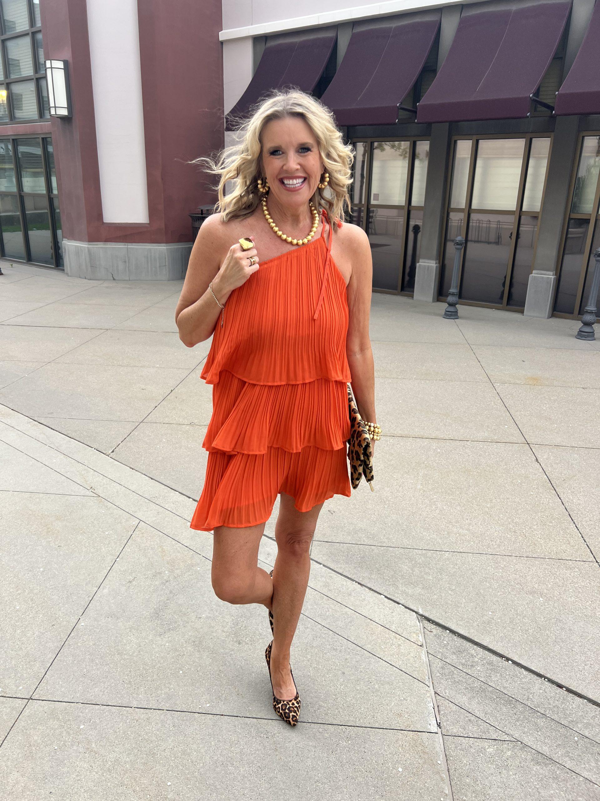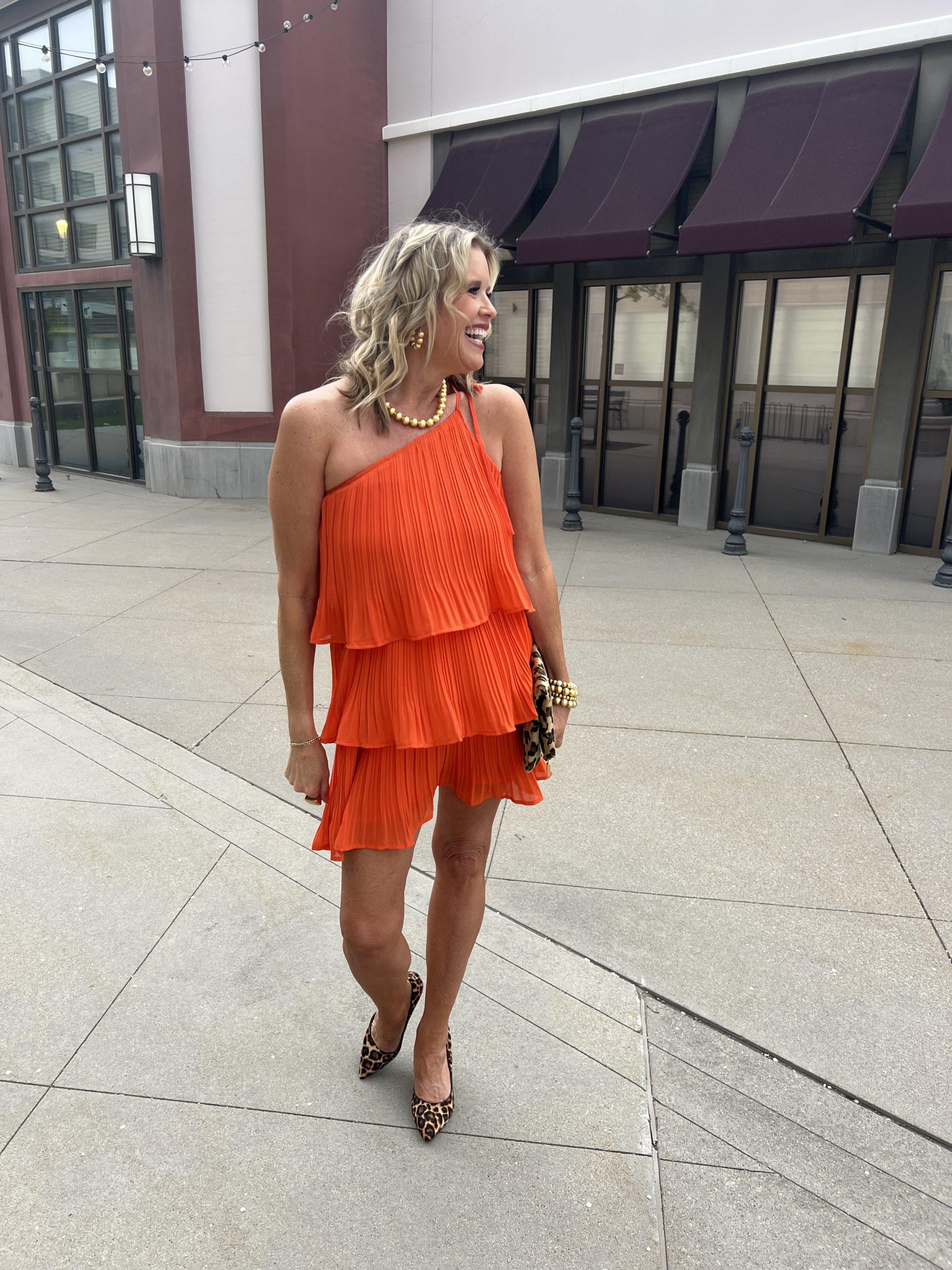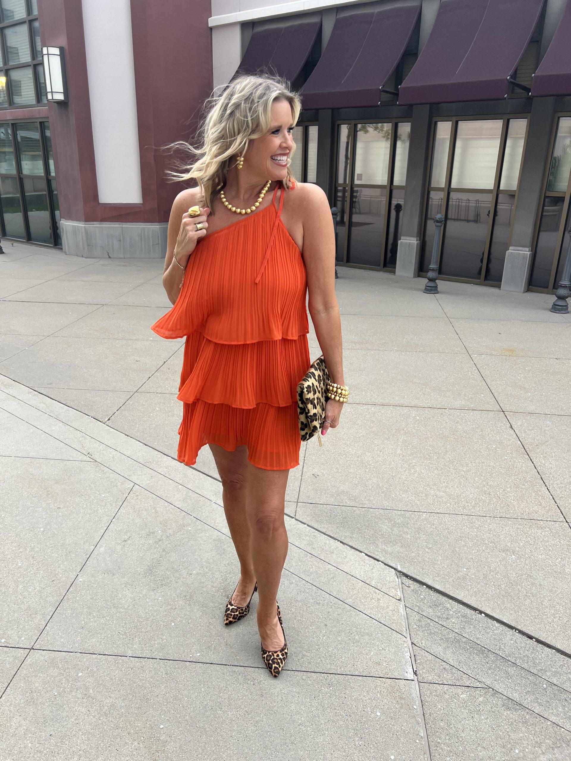 This little one-shoulder Orange ruffled dress hits above the knee and has been my best seller. It’s a little flirty and a touch sexy, yet still classy. This dress is great for a night out on the town, a date night, or cocktails with friends. I have styled it with a pop of leopard for a fun, flirty look, but you could easily restyle this number with nude or raffia heels and a clutch for a wedding or vacation look. The gold beaded jewelry by Lisi Lurch is my daily go-to; it is affordable and high-quality. They do not tarnish.