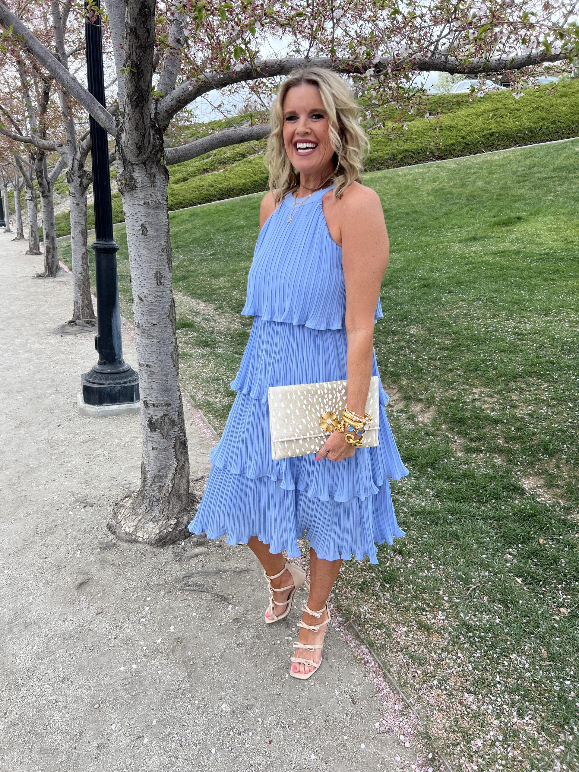 This Calf-length cornflower blue halter-style dress is easy to wear, flattering on every body type, and fits true to size. It’s no secret I’ve been crushing on this color and how stunning it is paired with these bow nude heels, custom-made Coastal Clutch NY bag, and Julie Vos Jewelry.