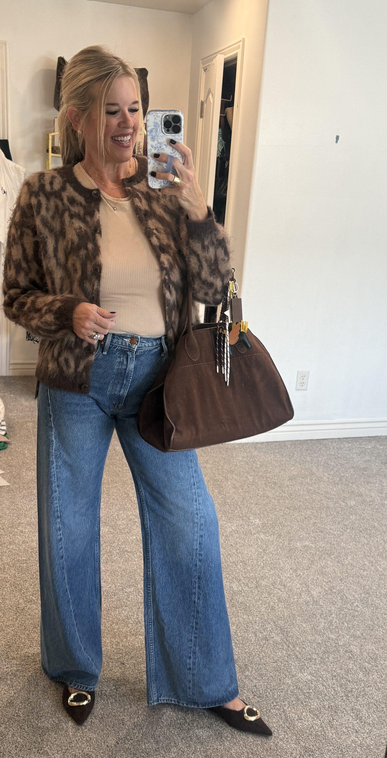 This outfit was fun to create, leopard is always a favorite of mine, and these jeans a comfortable and chic. Capes are trending, and Chico’s added a fun twist with a ruffled hem in faux leather. Anytime Chico’s offers a cashmere sweater, I love to add it to my wardrobe. I reach for them all year long. Studded detail accessories are another trend, which makes it a fun detail to add to an outfit.