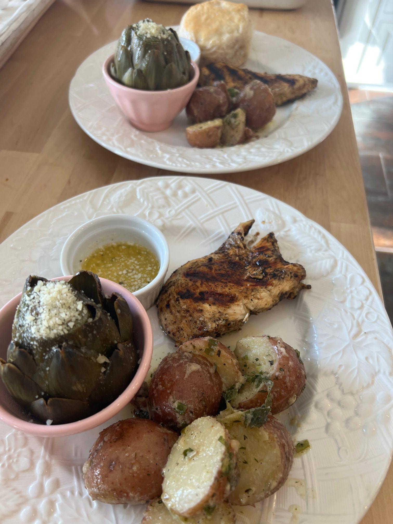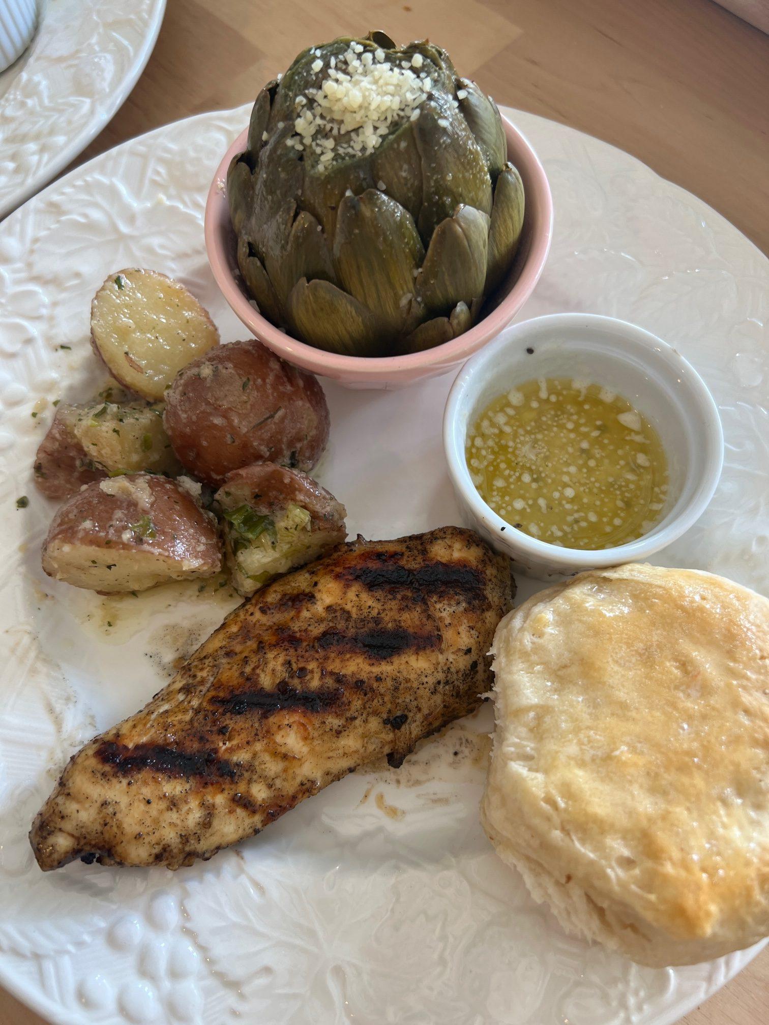 Baby red potatoes with green onions, & garlic butter, and a homemade buttermilk biscuit!