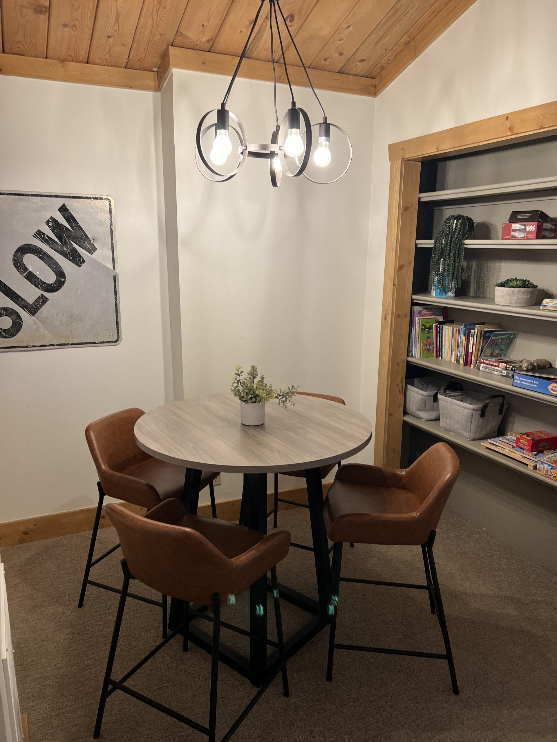 Indoor main lodge for lounging by the fire, reading a book, or getting some work done. A game room with a pool table, air hockey, board games, and snacks